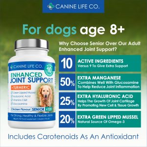 We have purposely “Enhanced with Turmeric” as Turmeric has been found to have significantly more anti-inflammatory and antioxidant power than other natural ingredients. Again, our formulation will provide a better effective ingredient mix for your dog’s joints and their wellbeing.